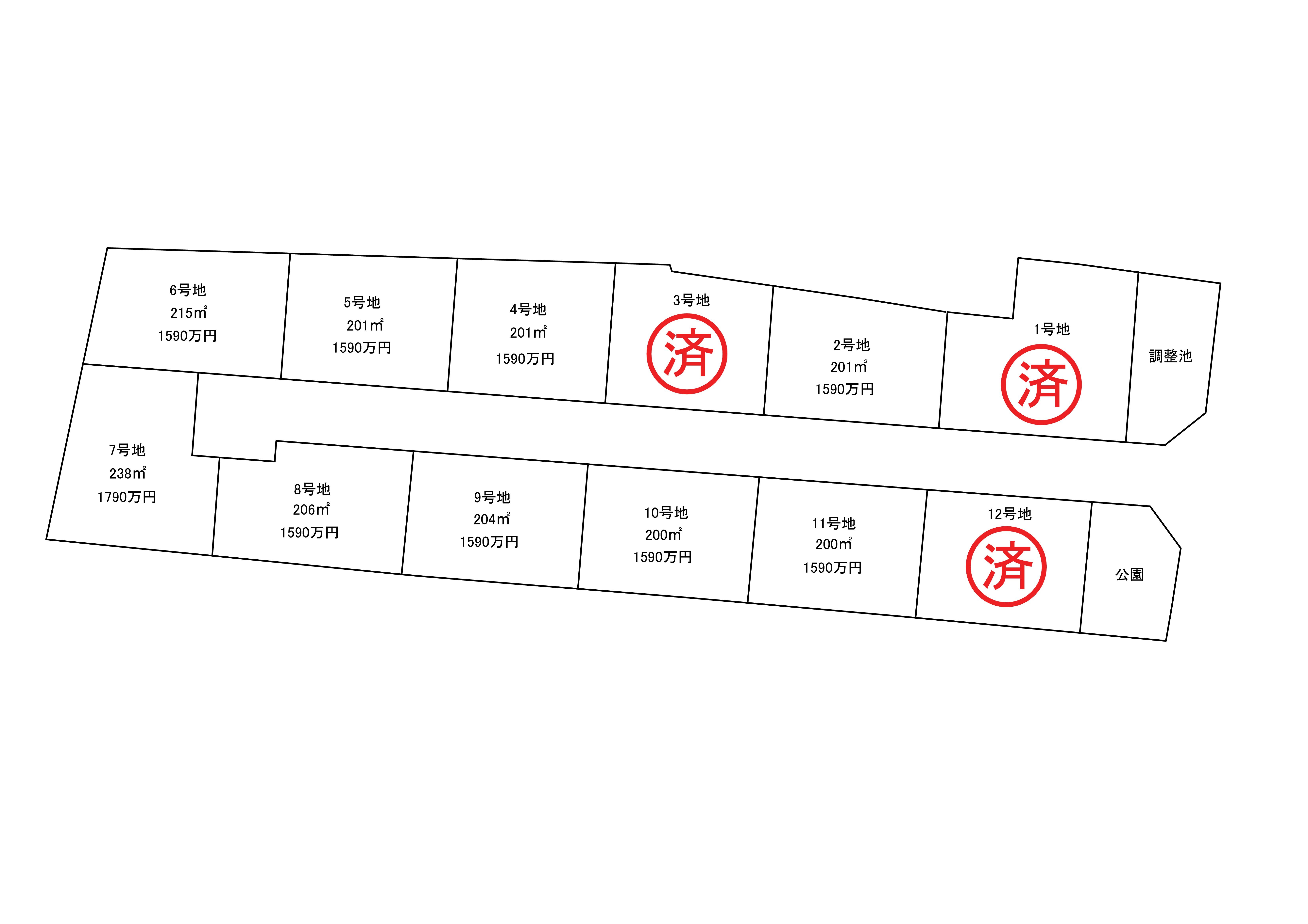 販売価格 | 1号地:成約済 2号地:1,590万円 3号地:成約済 4号地:1,590万円 5号地:1,590万円 6号地:1,590万円 7号地:1,790万円 8号地:1,590万円 9号地:1,590万円 10号地:1,590万円 11号地:1,590万円 12号地:成約済 |